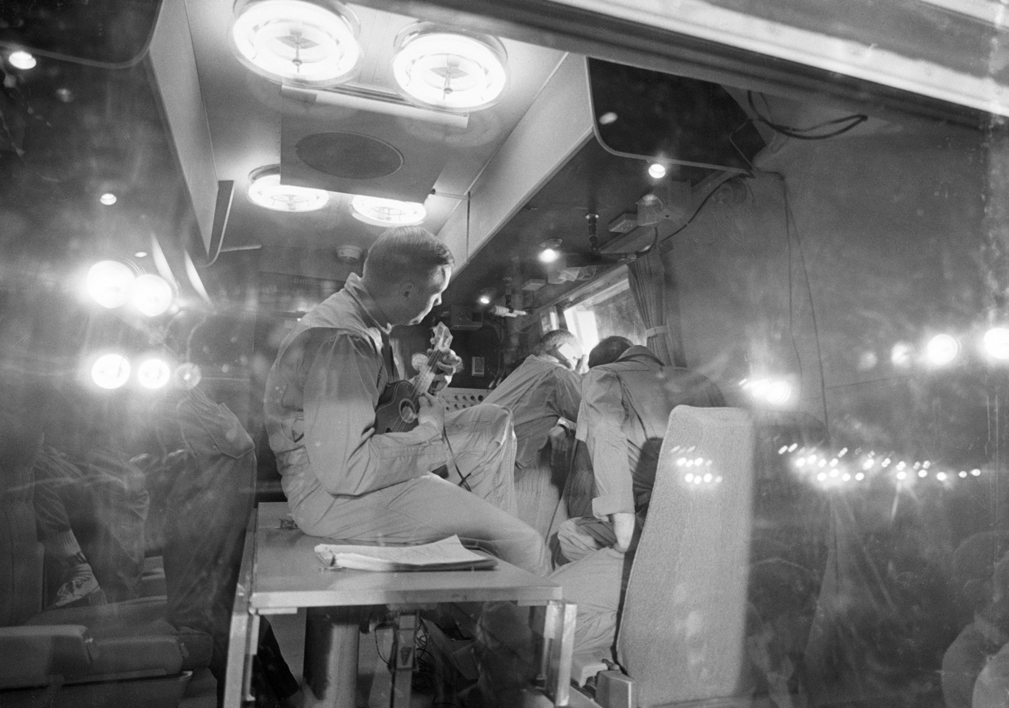 On the other side of the blackout, the carrier U.S.S. Hornet is waiting for Columbia. It’s just before dawn in the middle of the Pacific Ocean. Two helicopters with specially trained crews are already airborne, flying about, waiting for word of the capsule’s exact position.