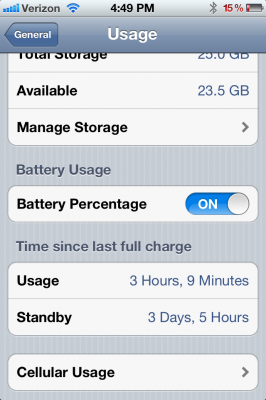 iPhone users: Here’s something useful that I found by accident. The little battery indicator on the top-right part of the screen is a little small for my taste. I can never really tell if it’s low, or critically low. But there’s a setting that will let you see the amount of battery left as a percentage.