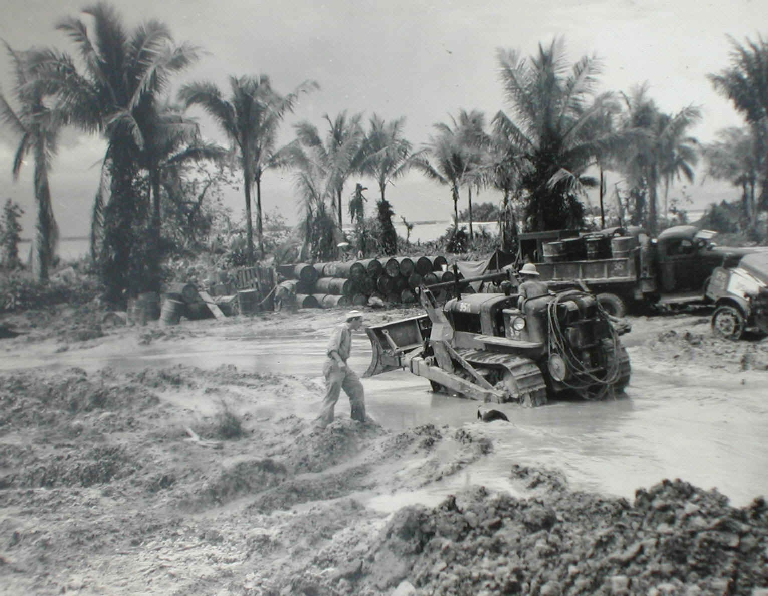 Every few hours, planes from the nearest Japanese base would fly over and bomb and strafe the field. My grandfather told me about having to dive under his tractor to avoid the bullets! At the same time, the Japanese soldiers still on the island would sometimes get within mortar range, or a sniper would sneak up close enough to start firing on the field.